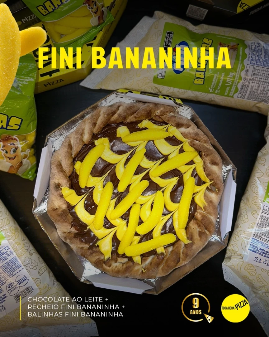 ✨EDIÇÃO LIMITADA✨ Pizza BROTO 20cm - Rende 6 fatias pequenas Uma deliciosa mistura de Chocolate ao leite, recheio Fini Bananinha e balinhas fini. Rende 6 fatias pequenas.